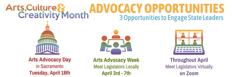 Join us for Arts Advocacy Day in Sacramento, meet with representatives in-district during Advocacy Week or meet with them on zoom throughout Arts Advocacy Month. Californians for the Arts will help organize your groups and provide all the resources you need, including training and talking points.