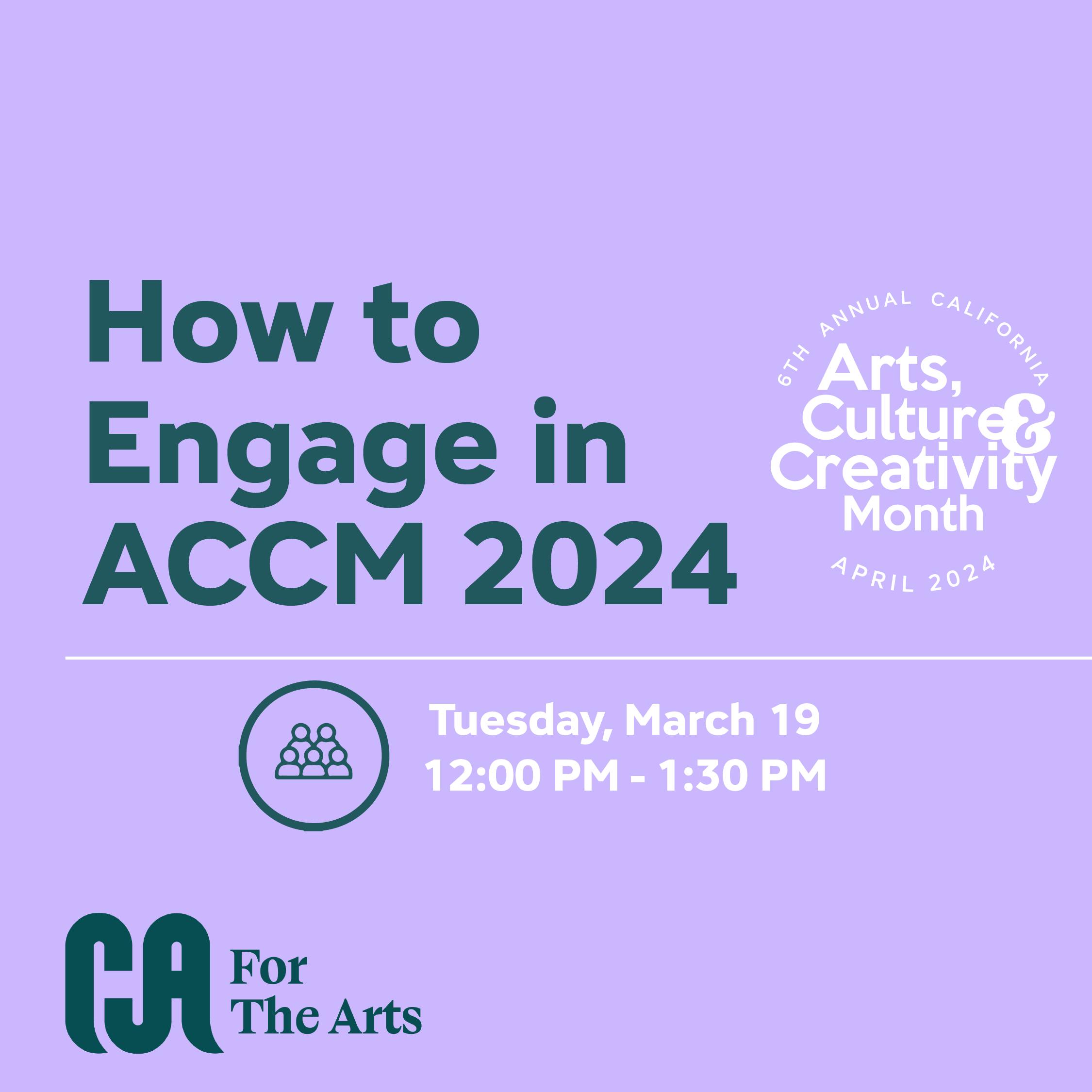 Join us on Tuesday, March 19, 2024 12:00 PM - 1:30 PM for "How to Engage in ACCM 2024"! This video serves as your comprehensive training guide for ACCM 2024, covering everything from user-friendly weekly social media posts, template proclamations, op-eds, and press releases to artist engagement, weekly webinars, and a detailed overview of our legislative and administrative requests for supporting public investment in arts and culture this year.